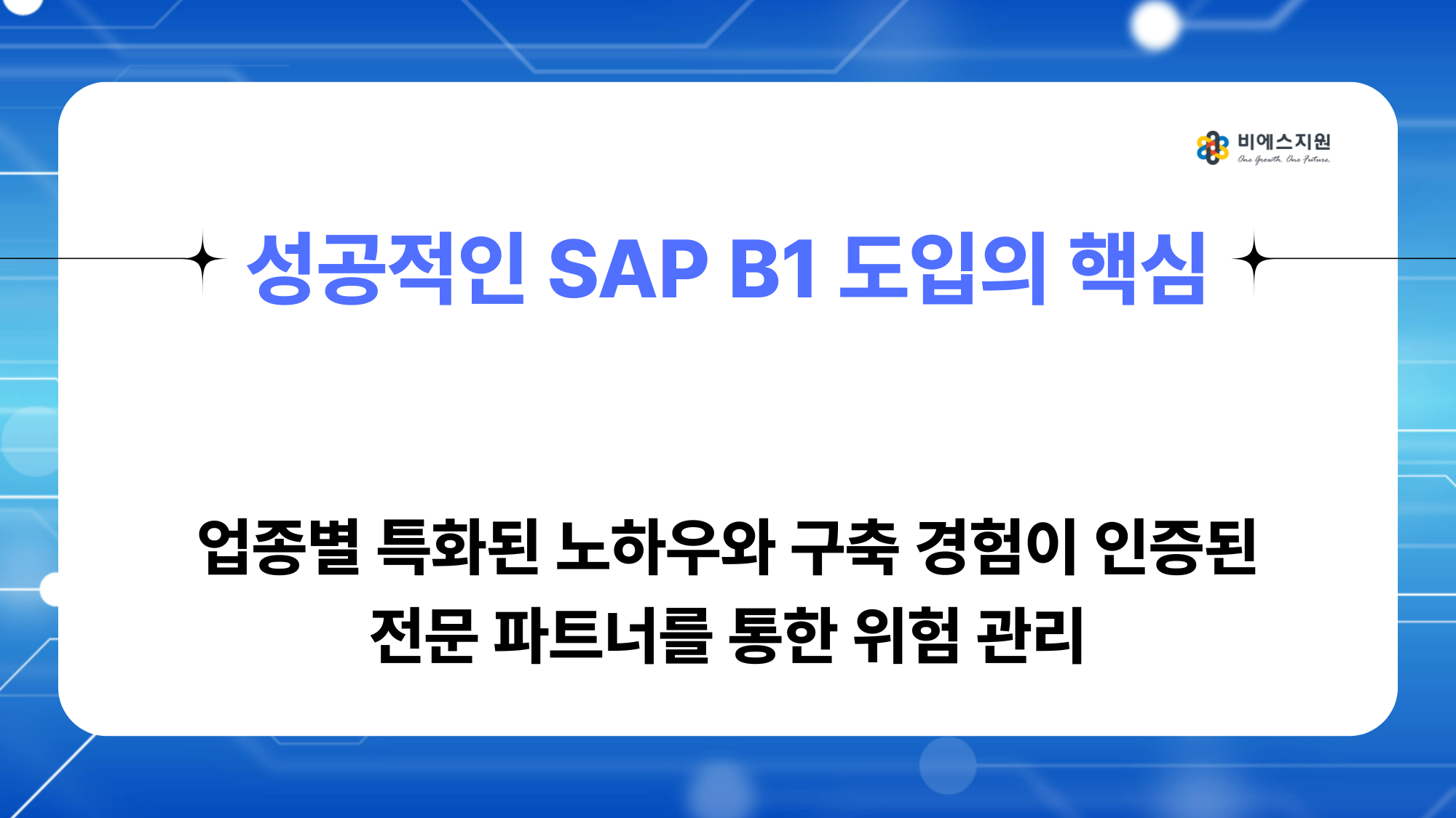 성공적인 SAP B1 도입의 핵심은 업종별 특화된 노하우와 압도적인 구축 경험으로 중소/중견 기업의 디지털 전환을 성공적으로 이끌어온 비에스지원의 전문성입니다.